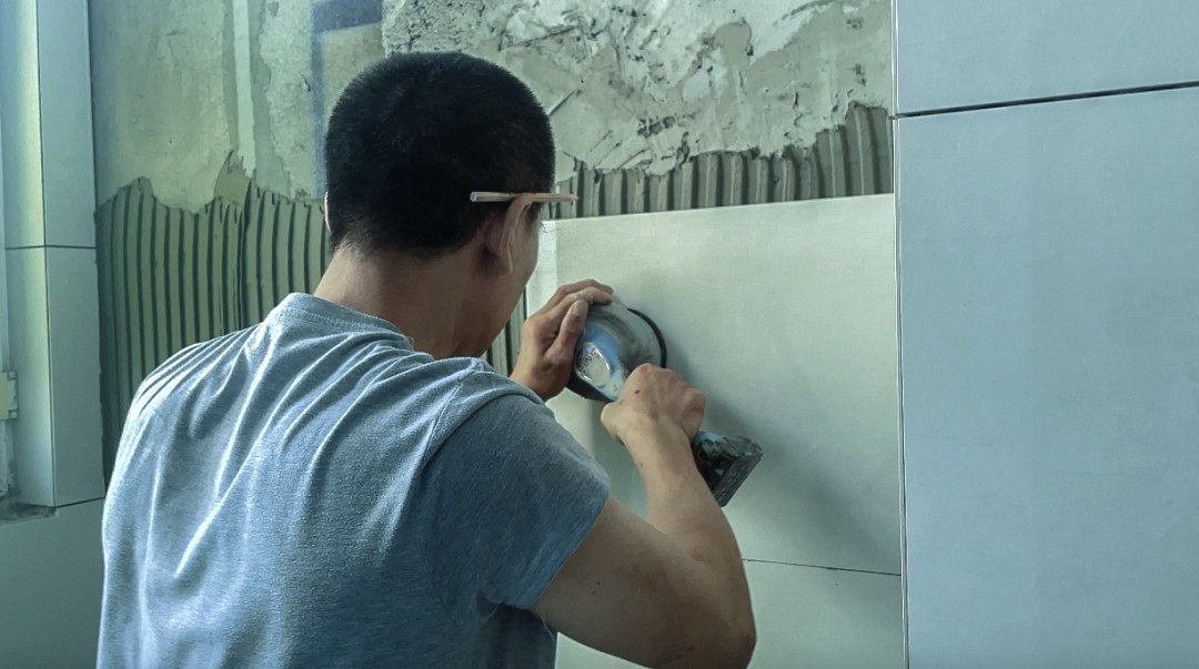 談到每一塊磚他是如何掌握厚度,并能保持一致的,他這樣回答:“我這都是笨方法,我用這個抹子在涂好的瓷磚膠上磕一下,就知道大概的厚度了,剩下的瓷磚全都保持一樣的厚度,這方法笨,但也挺好用的,都是自己研究總結(jié)?!?/span>